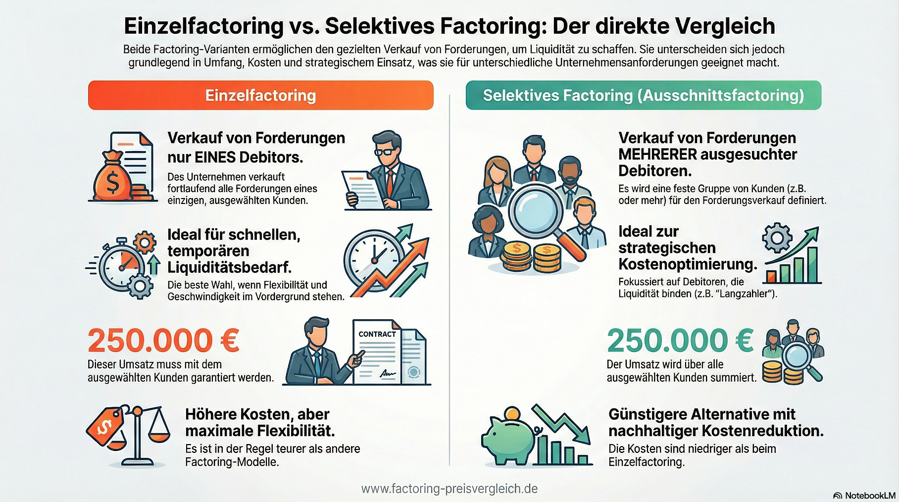 Einzelfactoring wird häufig missverstanden. Viele Unternehmen verbinden damit die Möglichkeit, einzelne Rechnungen nach Belieben zu verkaufen. In der Praxis ist genau das nicht zulässig. Dieser Artikel erklärt detailliert, was Einzelfactoring wirklich bedeutet, welche Voraussetzungen erfüllt sein müssen und für welche Unternehmen diese Factoringform sinnvoll ist.